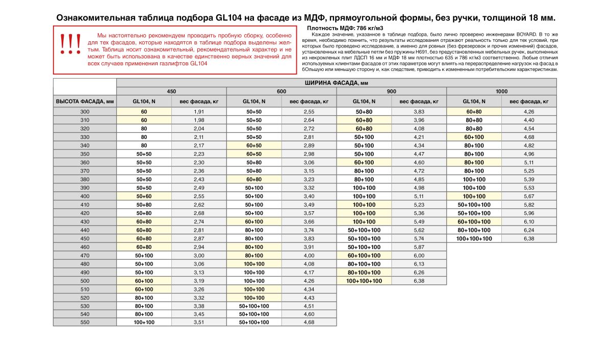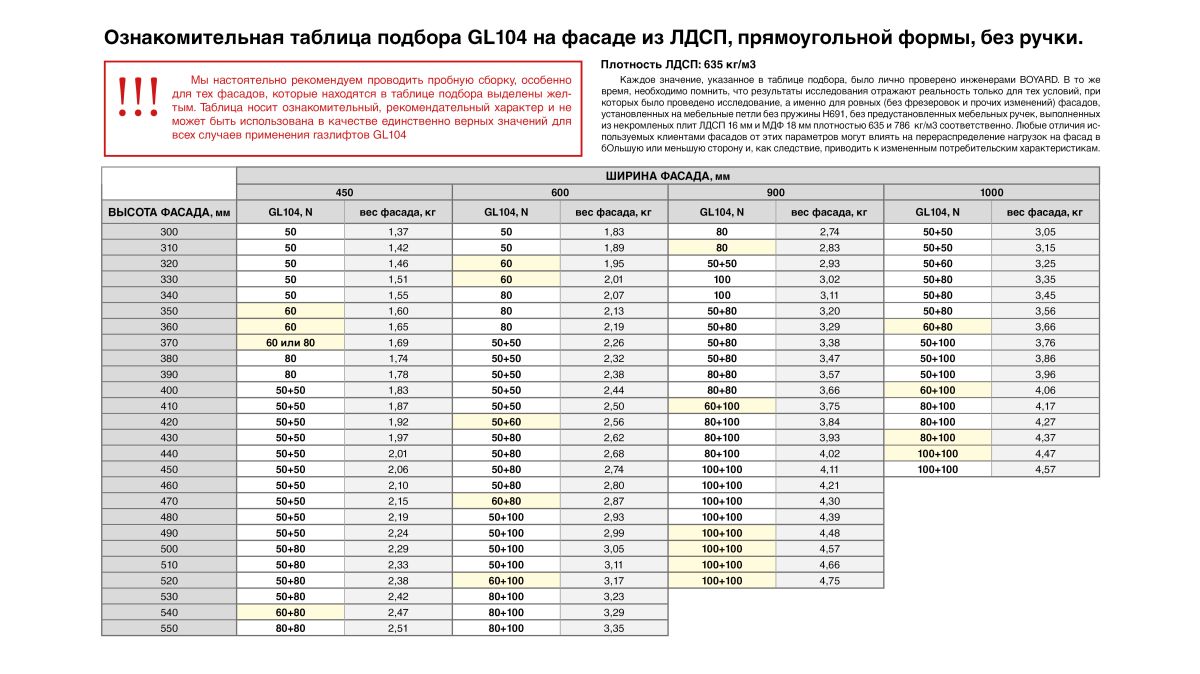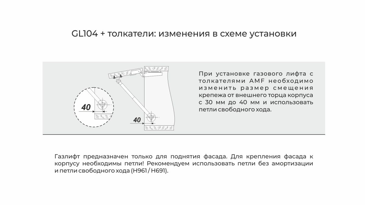 GL104 — газовый лифт, который открывает фасад вверх и может фиксировать его в любой точке. Представлен в 3 вариантах номинального усилия: 50N, 80N и 100N и рассчитан на 60 000 циклов открывания/закрывания.